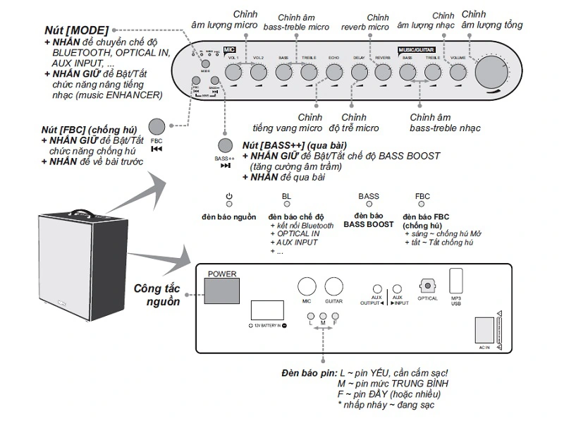 - Kết nối có dây: MP3 USB, OPTICAL, GUITAR, AUX IN/OUT, MIC 6.5, 12V BATTERY IN (+/-)
