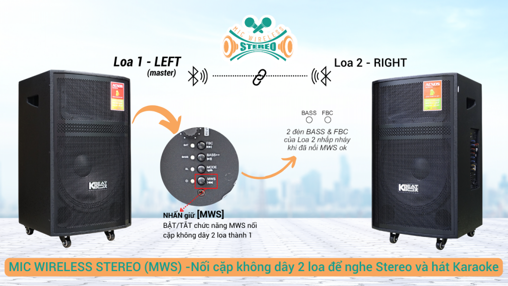 Mic Wireless Stereo (MWS) là công nghệ cho phép kết nối không dây 2 loa thành 1, tạo ra không gian âm nhạc stereo sống động, đặc biệt là khi người dùng kết nối Bluetooth với loa Master. Đầu tiên, tín hiệu kênh bên trái và kênh bên phải (LEFT – RIGHT) được truyền dẫn đến 1 loa, sau đó loa này chỉ phát tín hiệu bên phải và gửi tín hiệu bên trái cho loa còn lại để tái tạo âm thanh Wireless Stereo.
