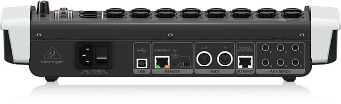 Mặt sau mixer behringer X18 với 6 cổng Aux1 đến Aux6 dùng để sử dụng cho loa sub và loa monitor với các cổng jack 6 ly.